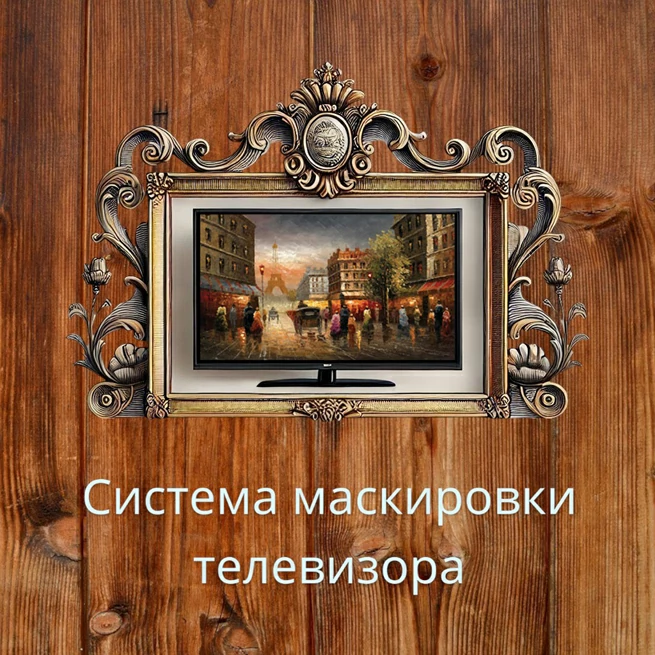 Система маскировки телевизора багетной рамой с картиной в интерьере дома, квартиры, гостиной.