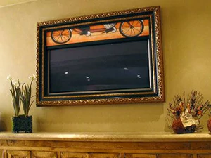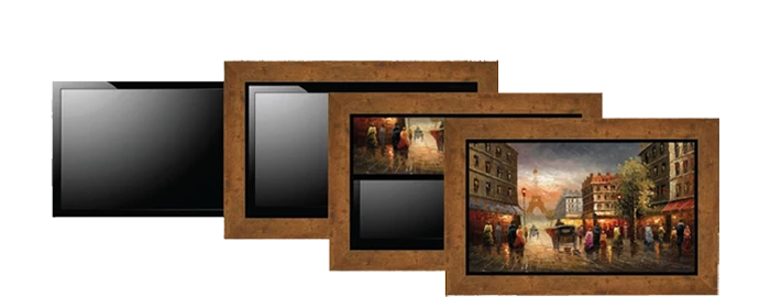 телевизор как картина спрятать телевизор, картина поднимается вверх открывается телевизор, за картиной телевизор в багетной раме маскировка телевизора в интерьере, телевизор в багете багетная мастерская в Москве |